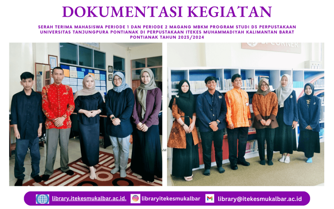 Pontianak, Rabu 20 Februari 2024. Perpustakaan Institut Teknologi dan Kesehatan Muhammadiyah Kalimantan Barat dengan bangga menerima kedatangan mahasiswa magang dari Program Studi D3 Perpustakaan Universitas Tanjungpura Pontianak. Mahasiswa magang ini merupakan bagian dari Program Merdeka Belajar Kampus Merdeka (MBKM) periode 1 dan periode 2 tahun 2023/2024. Serah terima mahasiswa magang ini berlangsung dalam sebuah acara resmi yang dihadiri oleh berbagai pihak terkait, yakni Bapak Wakil Rektor 1 Bidang Akademik yaitu Bapak Supriadi, S.Kep.,Ners.,MHS.,Ph.D. Kepala Unit Perpustakaan yaitu Ibu Wiji Astuti, SIP. Dosen Pembimbing Lapangan yaitu Ibu Atiqa Nur Latifa Hanum, S.Sos.,M.A. dan mahasiswa magang D3 Perpustakaan.